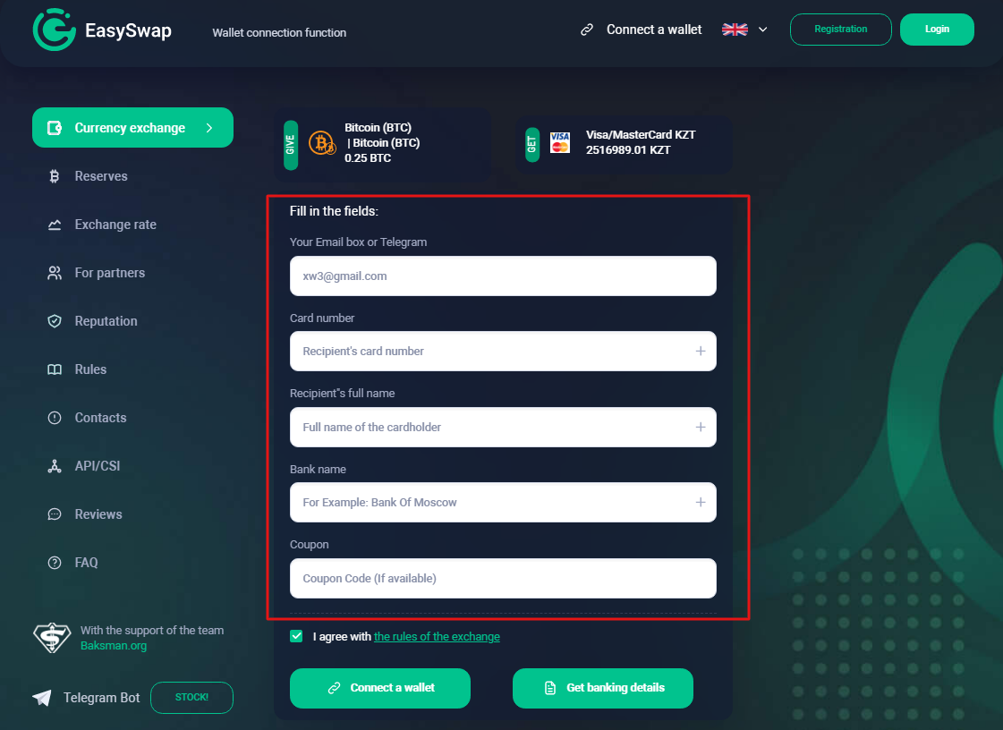 Click "Start exchange", which will mean your agreement with the exchange rules. Please familiarize yourself with them in advance;